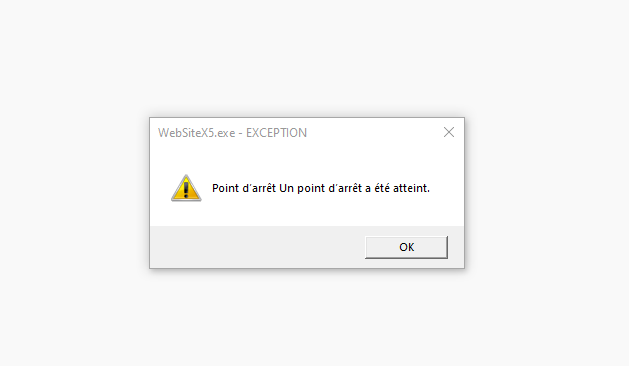 Web site plante avant de démarrer avec le message "point d'arrêt atteint"