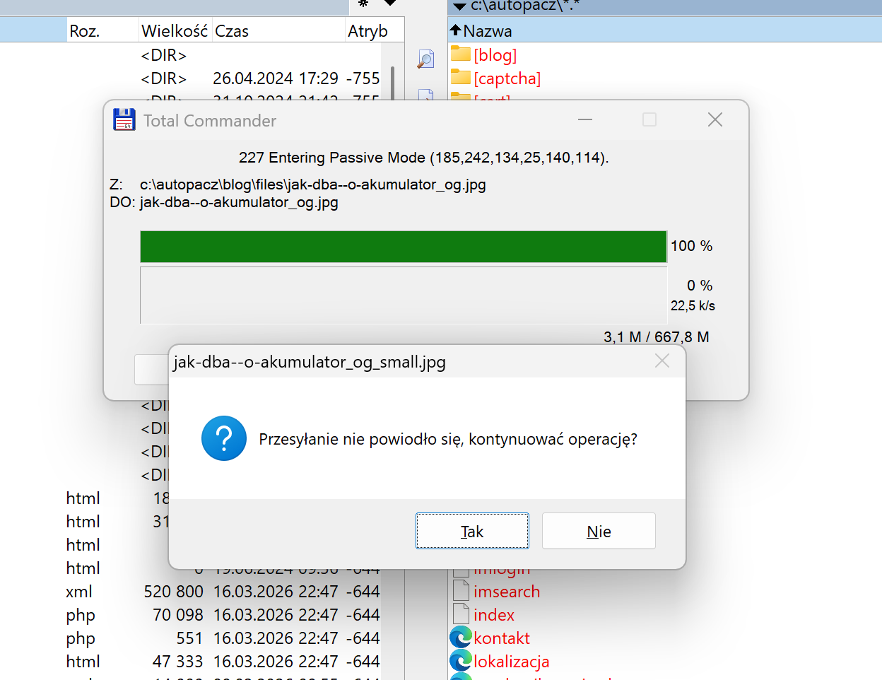 Cofnąłem się do starszej wersji programu i niestety to samo. Tak więc wyeksportowałem stronę na dysk i zacząłem ją kopiować poprzez Total Commander i niestety nadal to samo! Także opisałem dokłądnie sprawę do mojego dostawcy hostingu z którym co prawda nigdy nie miałem problemów... no ale chyba zawsze może być ten pierwszy raz. Ewentualnie coś z moim komputerem