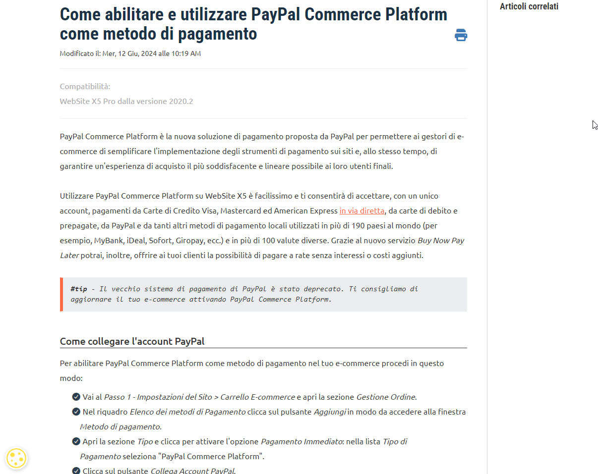 purtroppo a seguito di alcune modifiche apportate da PayPal negli anni passati, al momento le versioni del programma inferiori alla 2022.2.11 non dispongono di un browser interno sufficientemente aggiornato per poter riuscire a configurare Commerce Platform.