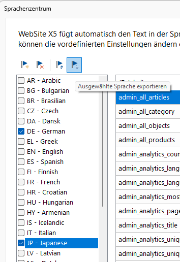 If you need to develop a website on two different computers in a language that is not catered for by the Program, you can export the new language created on one of the computers and import it on the other.