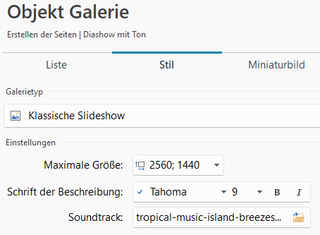 Beim Objekt "Galerie" habe ich die vorgegebene "Maximale Größe" beibehalten, siehe Screenshot