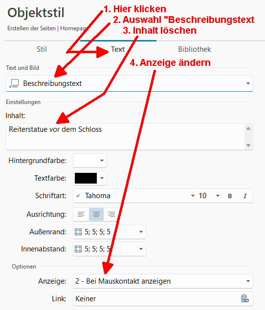 Das Bild-Objekt im Raster markieren, dann oben auf "Stil" klicken und hier den Reiter "Text" anklicken, dann kommen die Einstellung für das Einblenden des Textes bei Mouseover, siehe
