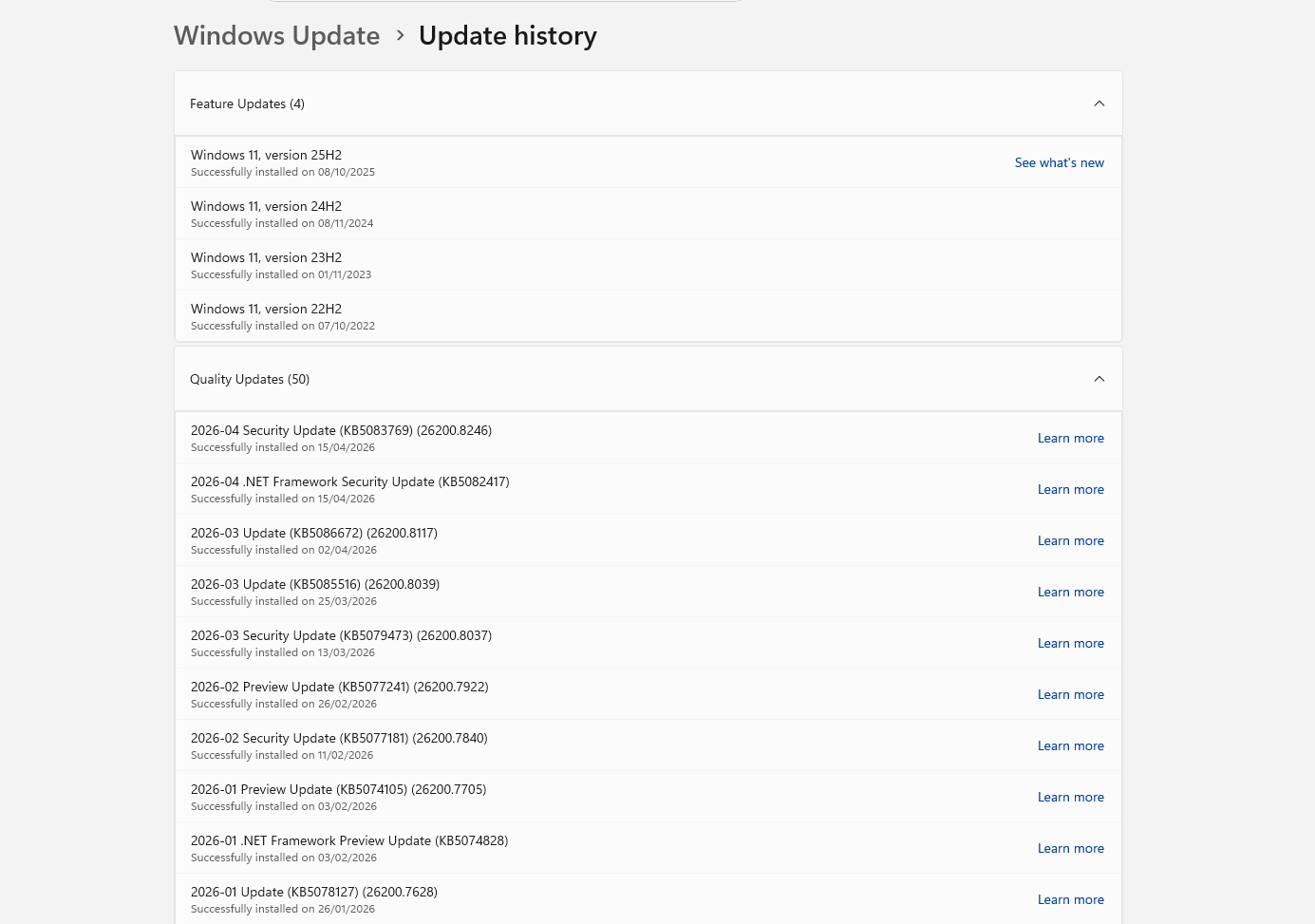 here is the update history