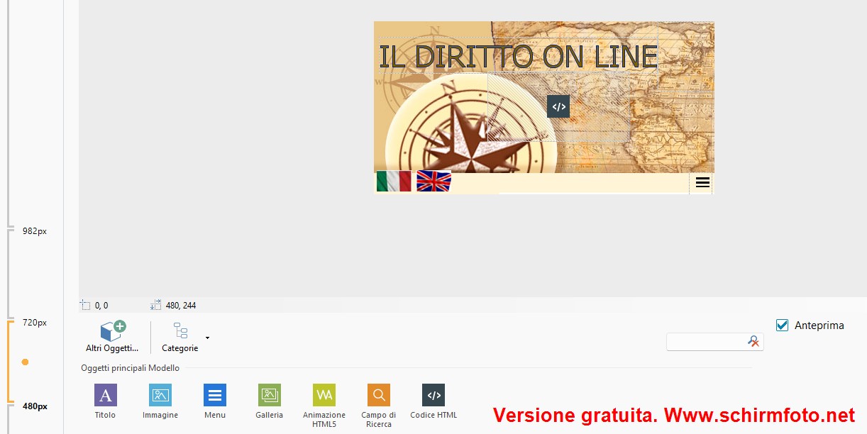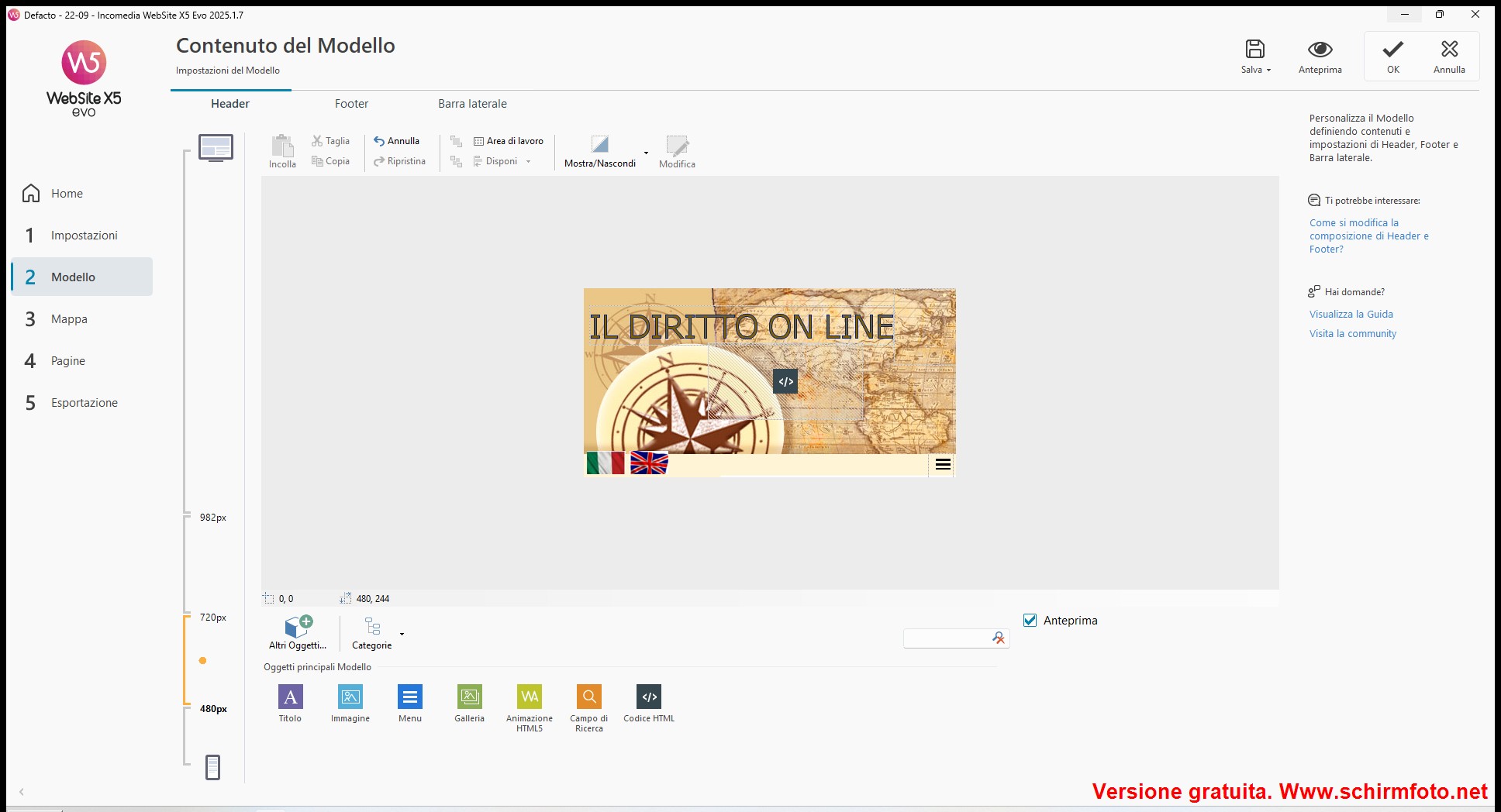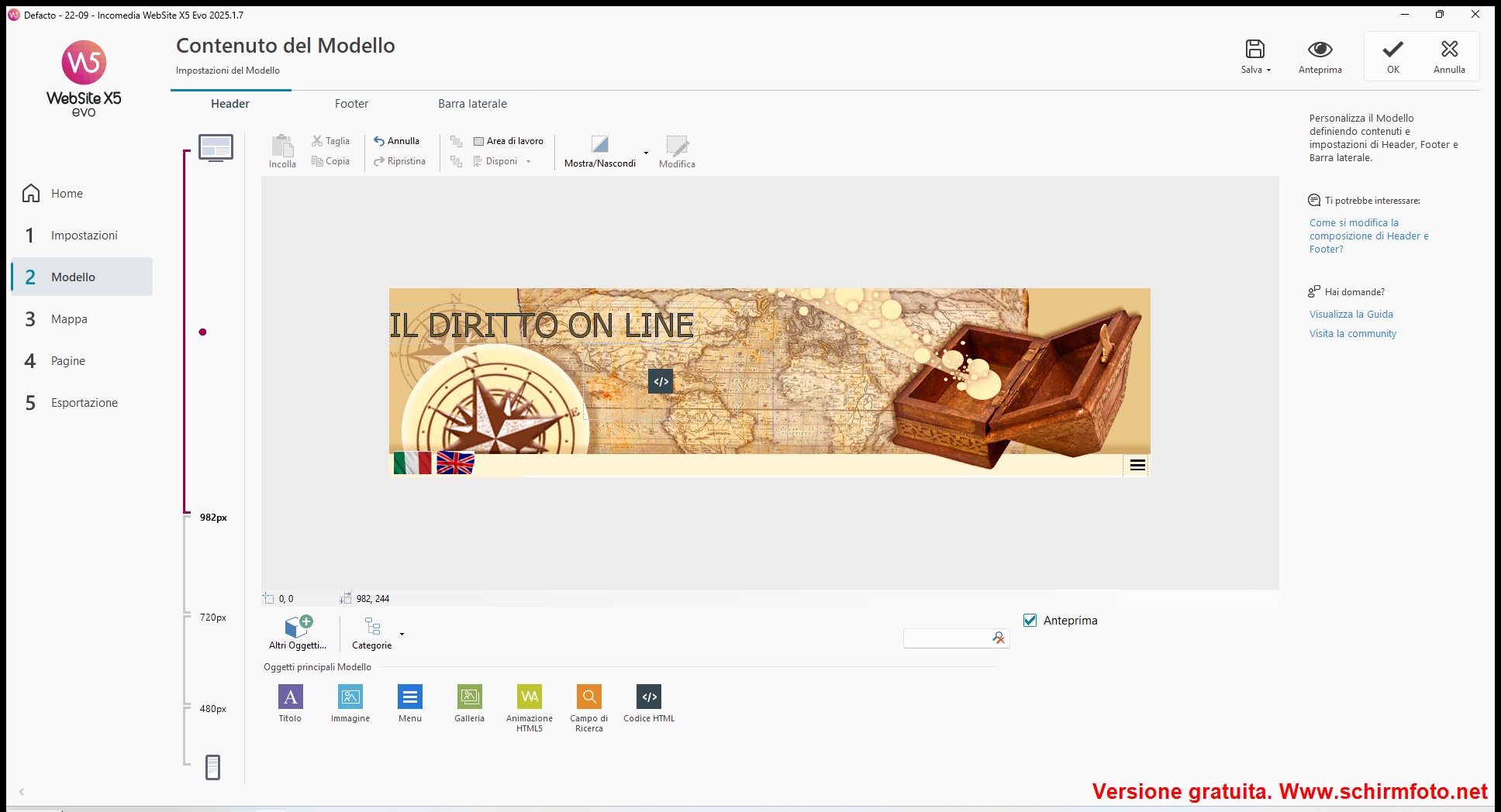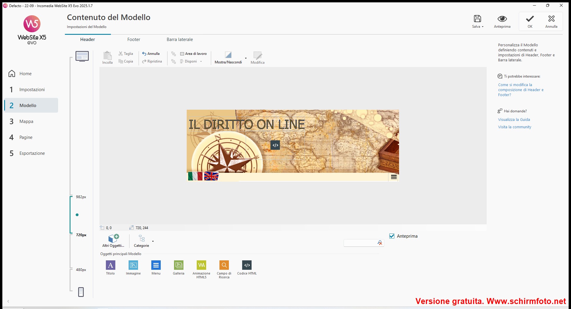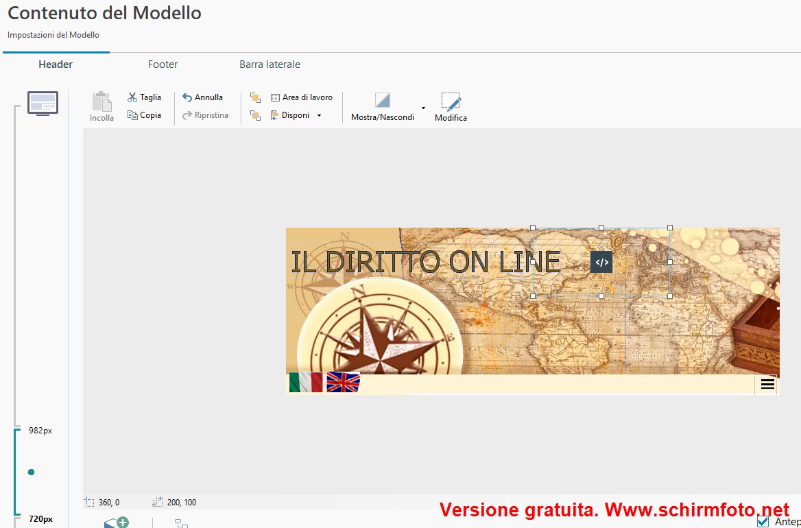Una volta preso Posiziona l'oggetto HTML o sull'header o sul footer ma meglio sull'header. Per capirci l'header è la parte più alta del tuo progetto e ci lavori dal passo 2 facendo poi click su CONTENUTO DEL MODELLO. Praticamente hai presente dove su un sito hai la scritta "DIRITTO ON LINE"? Ecco quello è il tuo header. Una volta posizionato (a destra o sotto la scritta) fai dopio click sull'oggetto html e riporta all'interno tutto il codice che ti ho dato. Salva tutto. SE funziona, anche in locale, puoi eliminare tutte le pagine fatte in ingese.