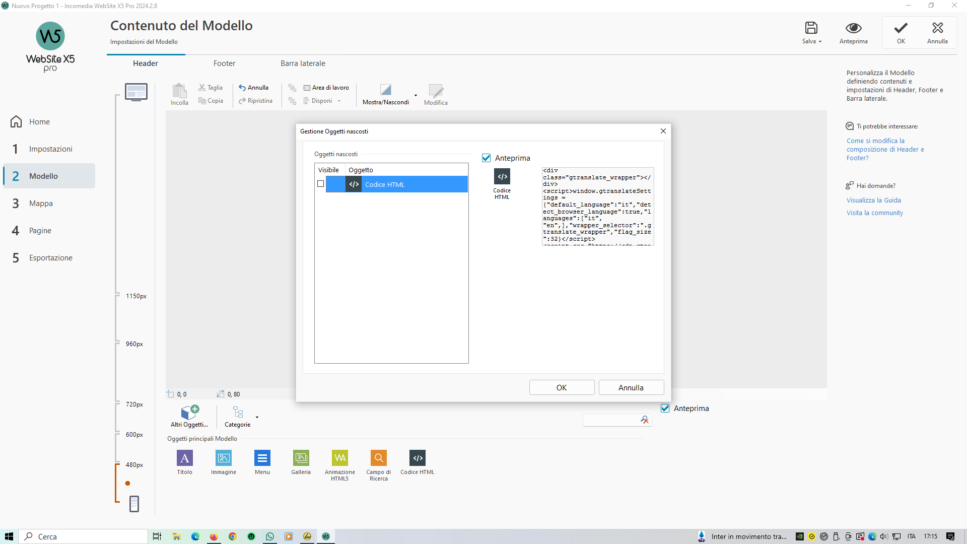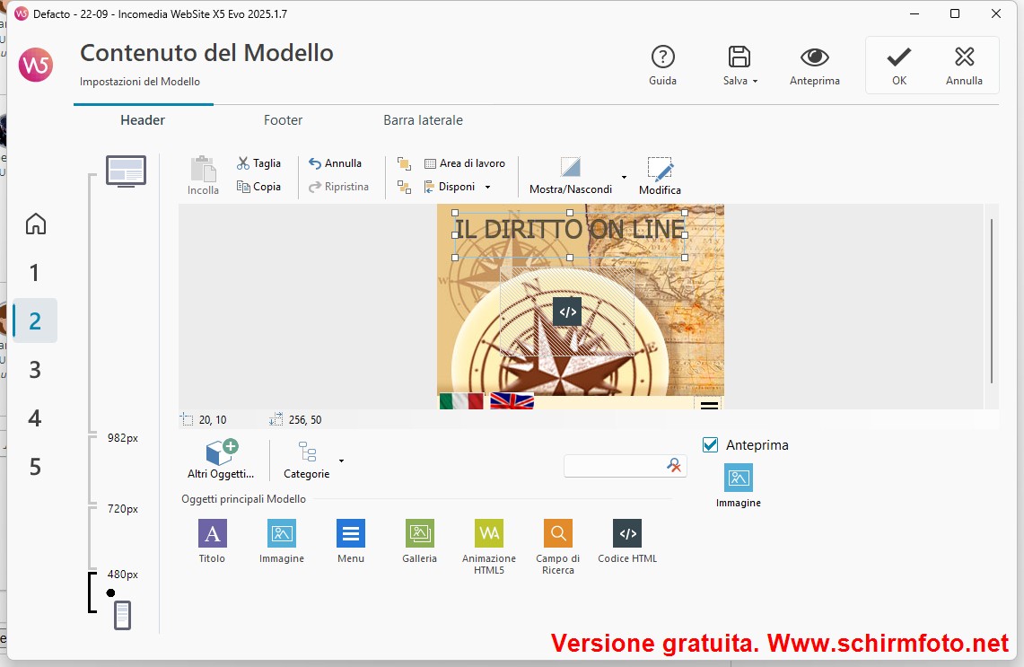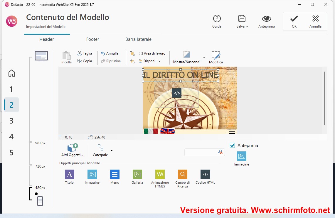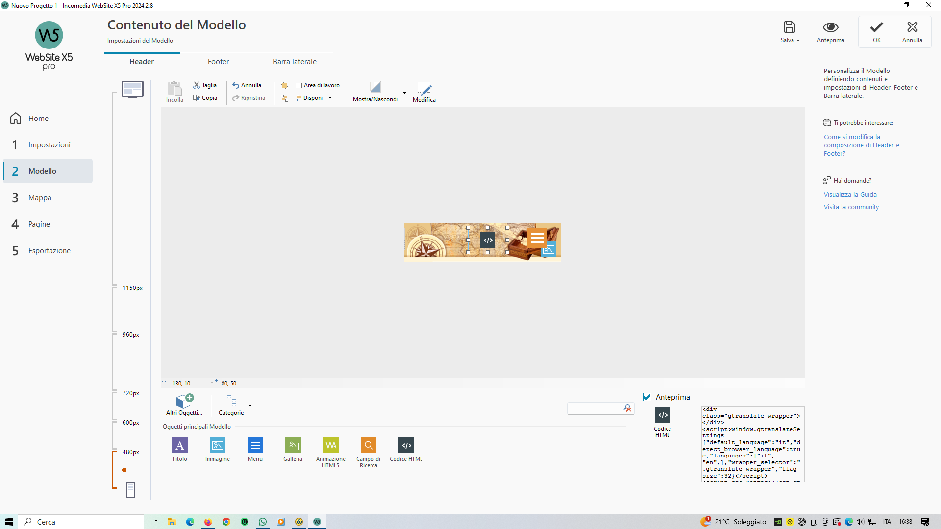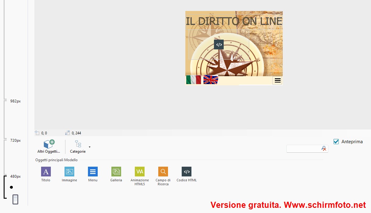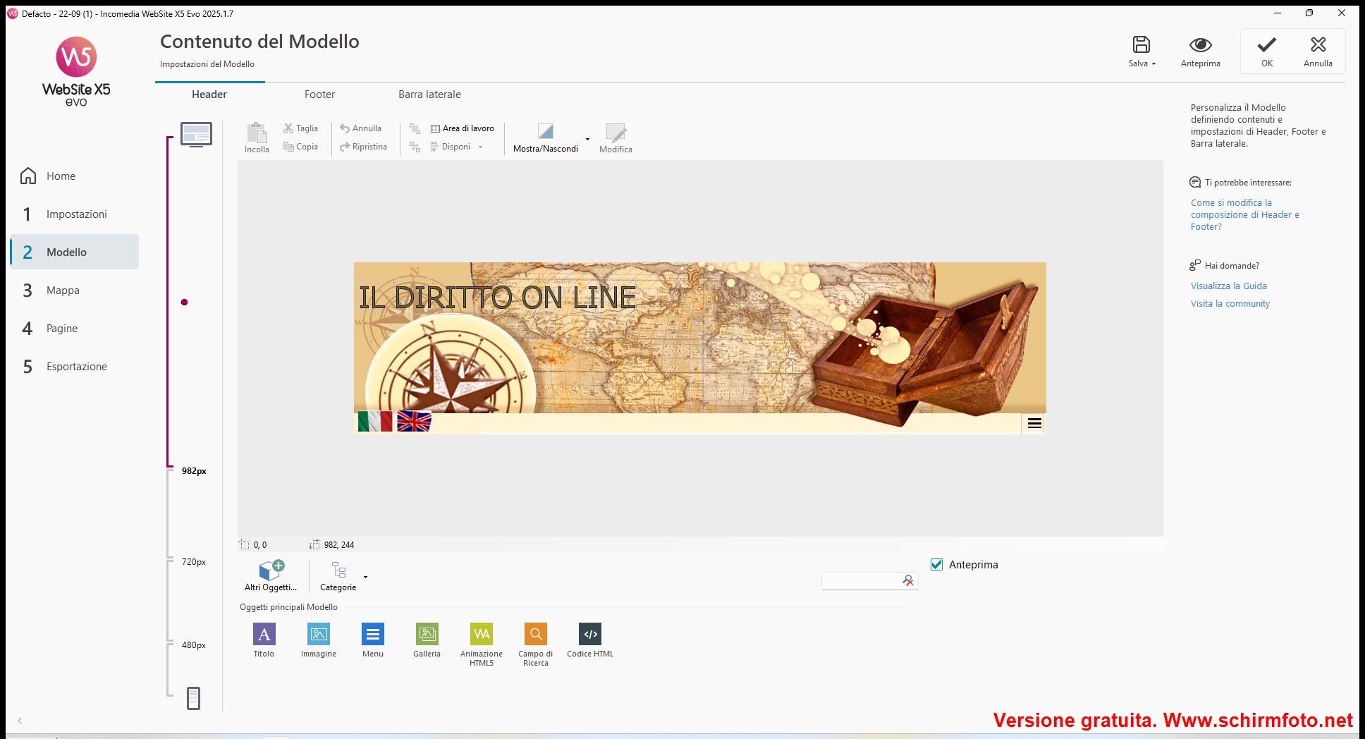 Una volta preso Posiziona l'oggetto HTML o sull'header o sul footer ma meglio sull'header. Per capirci l'header è la parte più alta del tuo progetto e ci lavori dal passo 2 facendo poi click su CONTENUTO DEL MODELLO. Praticamente hai presente dove su un sito hai la scritta "DIRITTO ON LINE"? Ecco quello è il tuo header. Una volta posizionato (a destra o sotto la scritta) fai dopio click sull'oggetto html e riporta all'interno tutto il codice che ti ho dato. Salva tutto. SE funziona, anche in locale, puoi eliminare tutte le pagine fatte in ingese.
