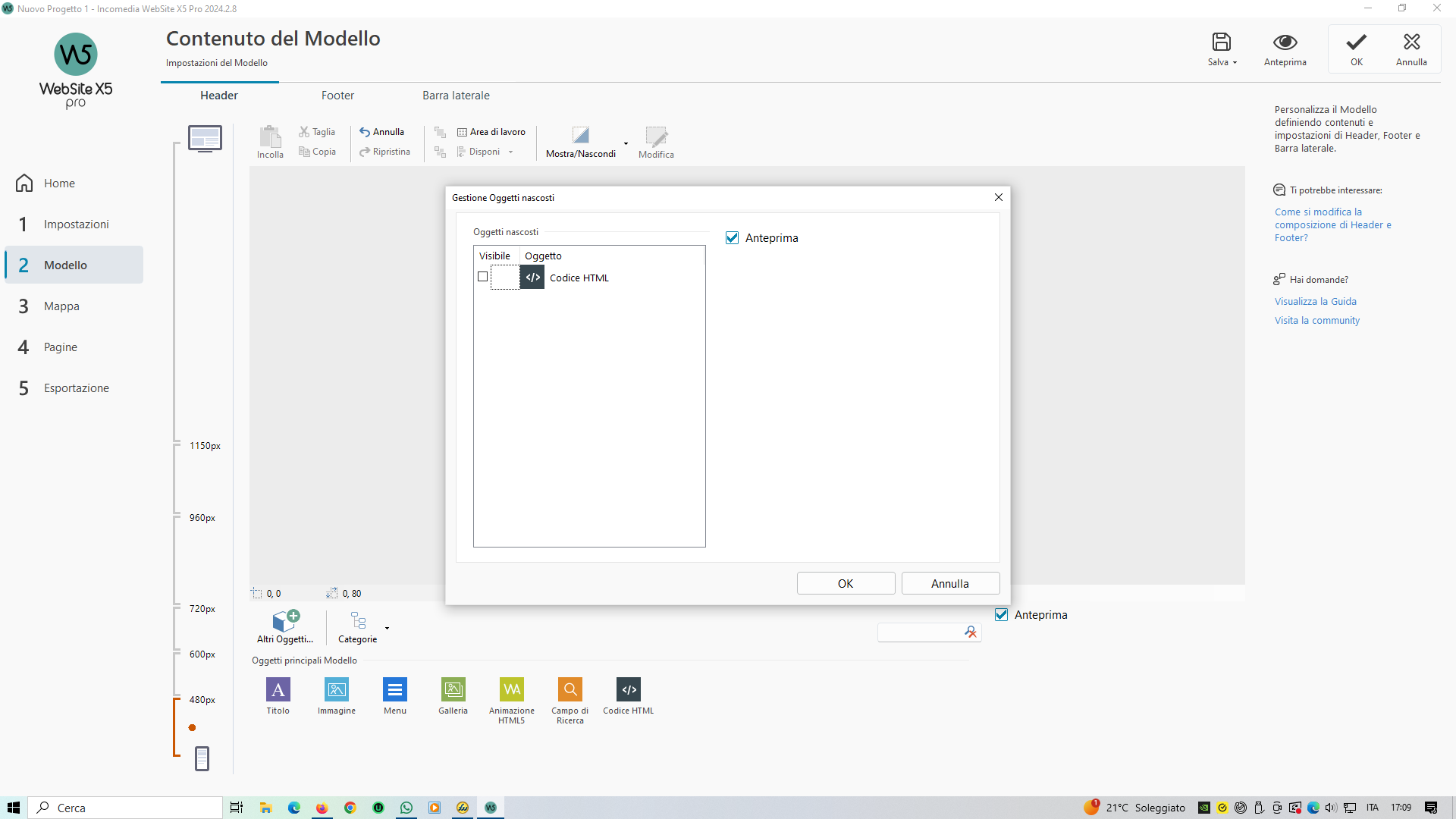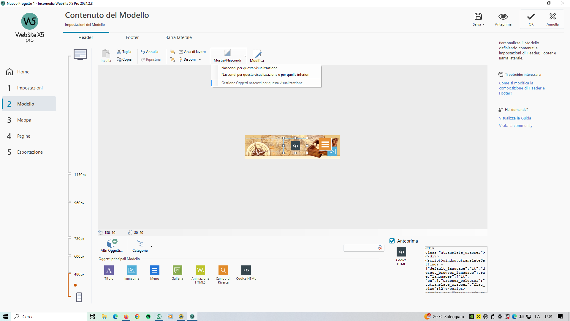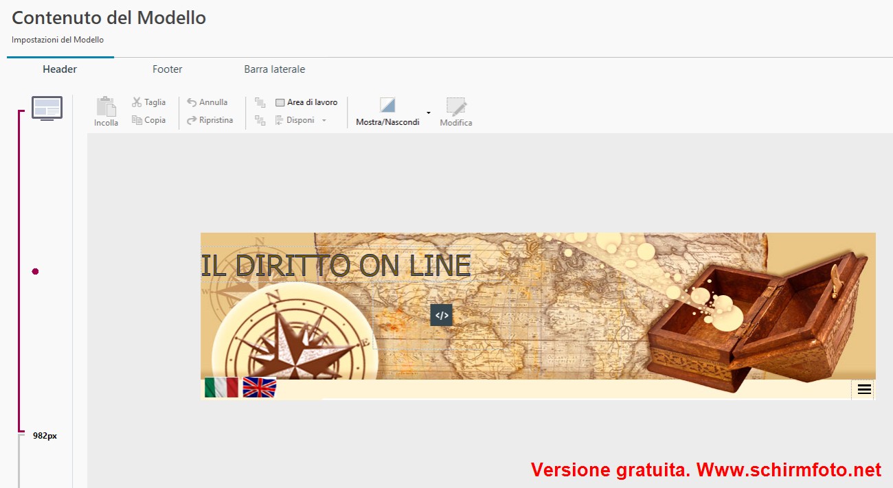invio lo screen della pagina contenuto del modello, in basso ci sono le varie icone, oggetti, galleria e CODICE HTML , se clicco su quest'ultima voce non si apre l'oggetto header, come mai? Grazie