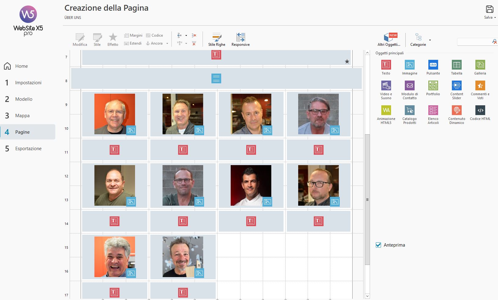 vorrei aggiornare una pagina del sito con nuove foto e testi. Come si vede dallo screenshot, nella sezione “Creazione della Pagina” tutto risulta corretto, così come nelle impostazioni “Responsive”. Tuttavia, quando vado a visualizzare la pagina pubblicata, i contenuti rimangono invariati o, in alcuni casi, peggiorano.