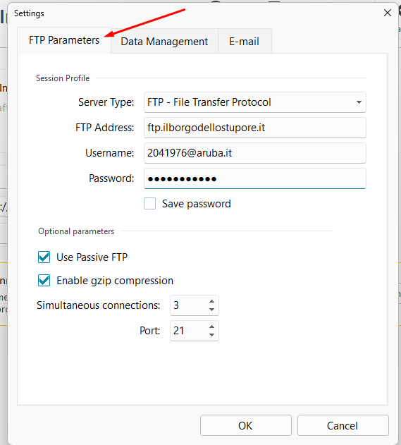 potresti verificare compilando in questo modo, nella sezione Parametri FTP?