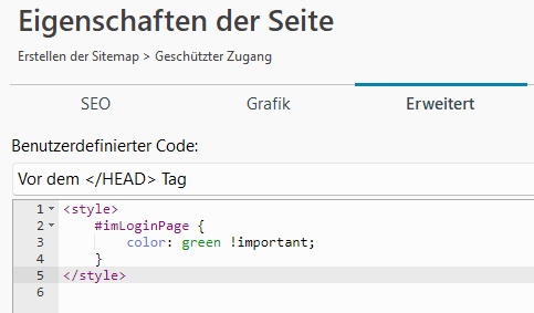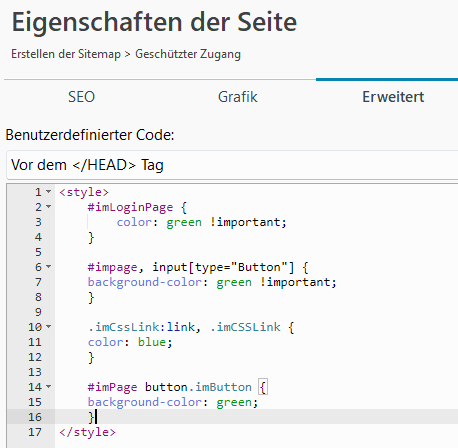 Ergänzungen des CSS-Codes im Reiter "Erweitert", um weitere Farben anzupassen.