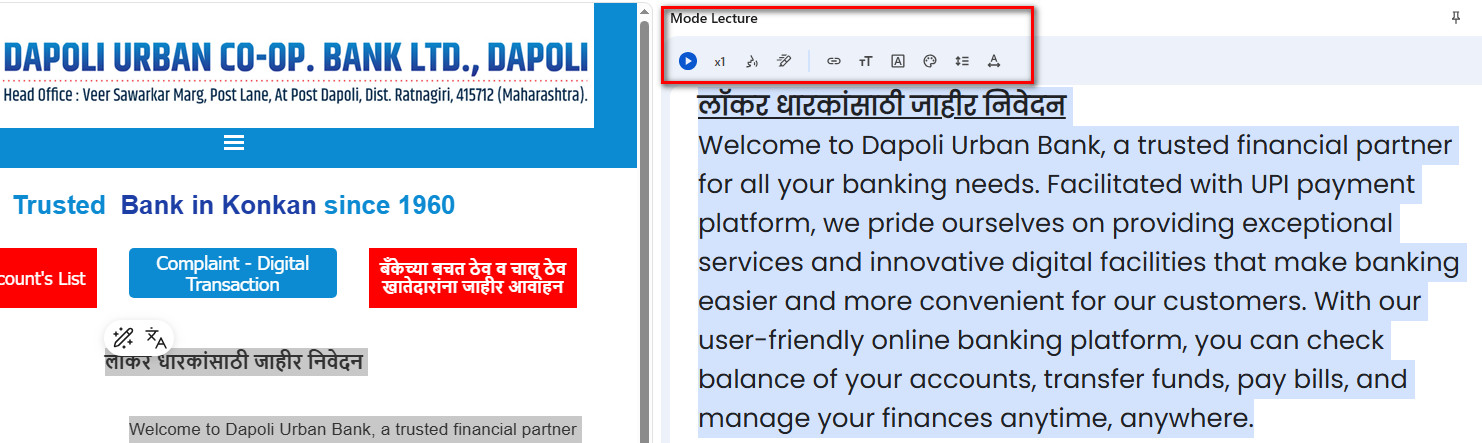 As per the order of RBI, must include a 'Text to Speech' facility on every page.