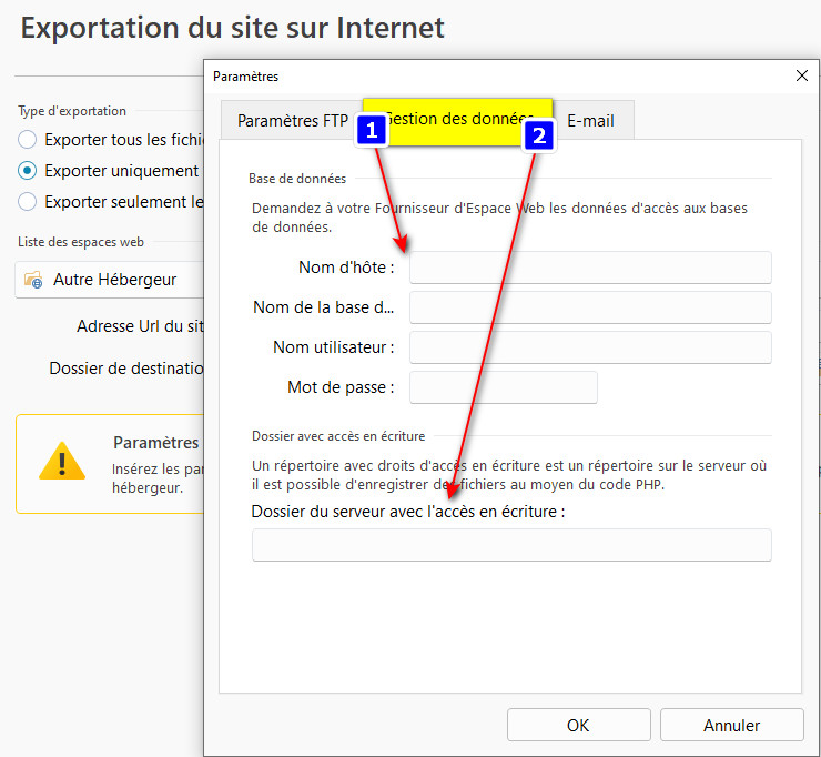 2.- Vérifier si la base de données est bien activée à la rubrique exportation et si le dossier du serveur est indiqué (et créé sur le serveur bien entendu) :