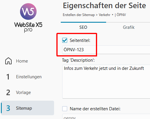 1) To set the standard H1 tag in WebSite X5, under "3 Sitemap", select the relevant page and click "Properties" at the top.