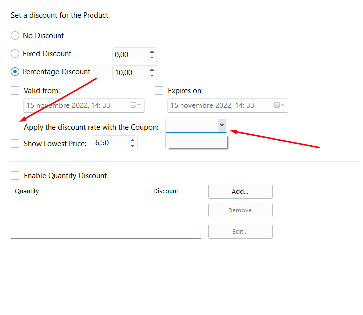 non intendevo nella pagina dei prodotti, ma nell'impostazione dei prodotti, alla voce "applica lo sconto solo sul coupon". Noto che massimo posso inserire solo due coupon, e se voglio annullare non c'è il tasto reset
