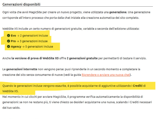 Una volta esaurite, è necessario acquistare generazioni aggiuntive tramite i Crediti WebSite X5, rendendo il processo tutt’altro che gratuito nel medio-lungo termine.