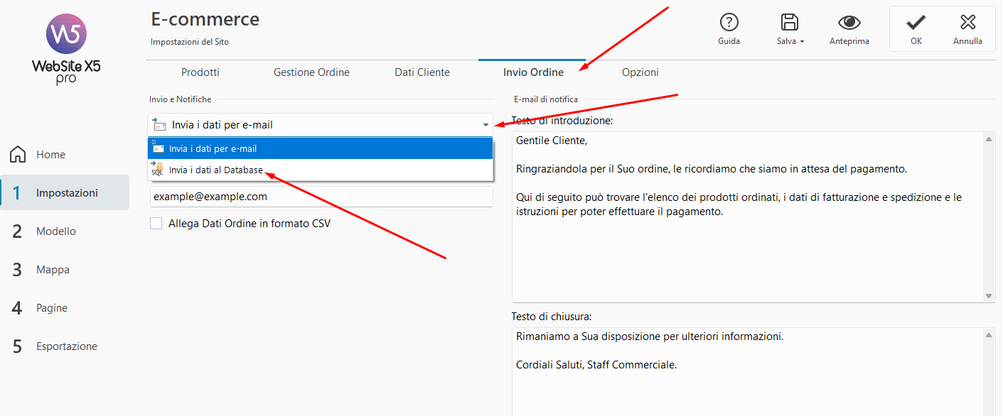 per poter visualizzare e gestire gli ordini dal Pannello di Controllo è necessario selezionare, per l'invio degli ordini, la modalità Invia i dati al Database: