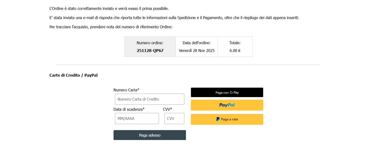 Una volta meso on-line, ed impostato l'acquisto e fatto l'acquisto, invece di andare al pagamento viene solo visualizzato il messaggio 'l'ordine è stato correttamente inviato e verrà evaso il prima possibile' col riepilogo.