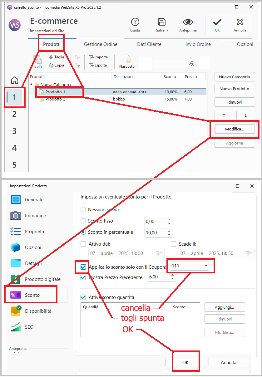 ... seleziona il prodotto > modifica > sconto > cancella > [V] > [ ] > OK...