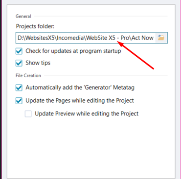 currently the software is using the default path, in Documents\Incomedia\WebSite X5 - Pro, but looking at your screenshots you have project folders saved elsewhere, such as in D:\WebsitesX5\Incomedia\WebSite X5 - Pro