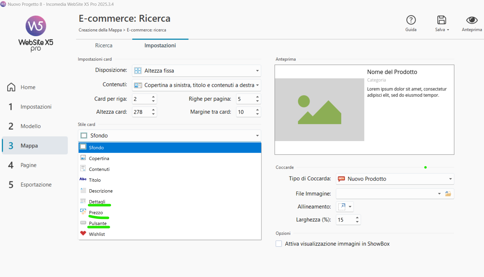 Vai al Passo 3 Mappa, vai in basso nelle Pgine Speciali, fai doppio click su "E-commerce: ricerca" e nella scheda che si apre vai in Impostazioni. Da lì clicca sulla casella STILE CARD a sinistra e scegli le voci barrate in verde nell'immagine sotto, puoi decidere se farle visualizzare o no selezionando le apposite caselle di visualizzazione.