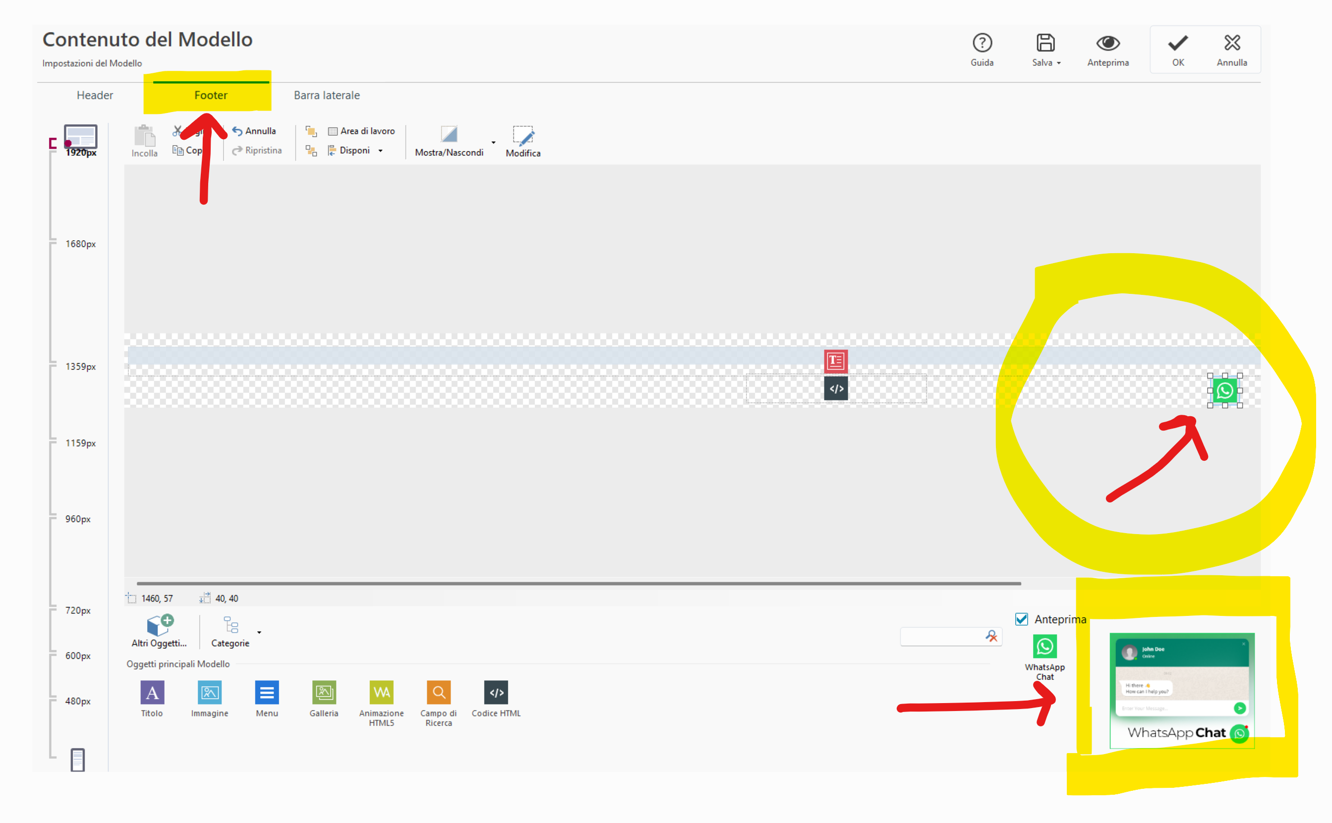 per avere fisso l'oggetto WhatsApp Chat in ogni pagina devi inserirlo o nel header o nel footer come sotto indicato: