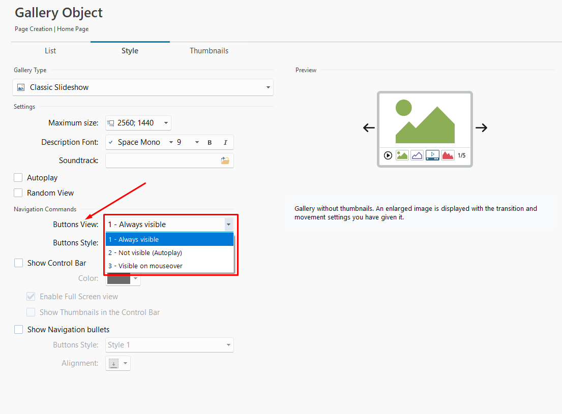 è possibile modificare la visibilità delle frecce dalla sezione Stile della Galleria, tramite le impostazioni per la navigazione nella galleria: