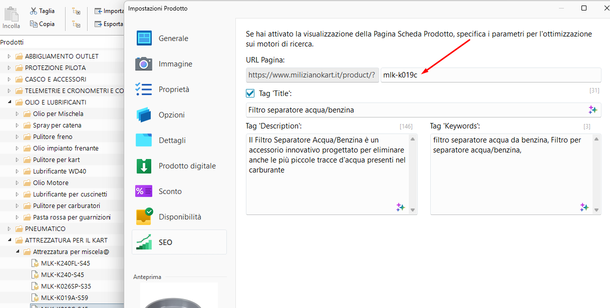 Ciao Eric, quando creo un prodotto nella E-commerce nella tabella impostazione prodotto nella sezione Nome: io metto per mia comodita il codice di quel prodotto che voglio vendere, esempio KS502 nel Codice SKU: riporto tale codice KS502, e cosi via compilo tutti i campi della tabella impostazione prodotto, se io vado sempre in impostazione prodotto nel SEO mi trovo in automatico compilato nella URL pagina https://www.milizianokart.it/product/? il codice del nome prodotto KS502 e fin qui va tutto bene, ma il mio fornitore ha cambiato il codice del prodotto che adesso è il seguente KS502-S50, se torno indietro e cambio il nome del prodotto mettendo quello nuovo quindi KS502-S50 nel SEO nella URL pagina https://www.milizianokart.it/product/? il codice del nome prodotto rimane ancora quello vecchio KS502 ed è qua che io ho cambiato questo codice mettendo quello nuovo KS502-S50, ho fatto questa modifica su 10 prodotti ed e da li che il sito non ha più funzionato correttamente. ho dovuto rimettere i codici vecchi ed esportato il sito, e si è rimesso a funzionare. secodo te è una cosa normale o c'è qualche altro problema? Mi capita spesse che i miei fornitori cambiano il codice prodotto cosa devo fare?