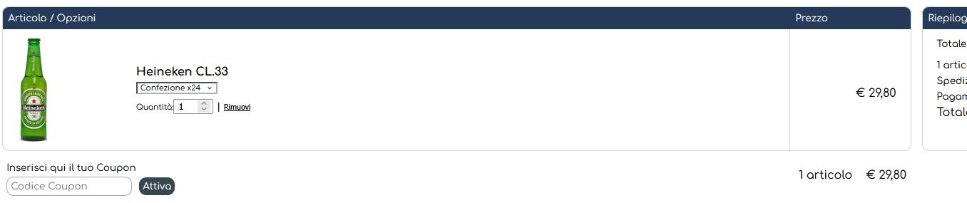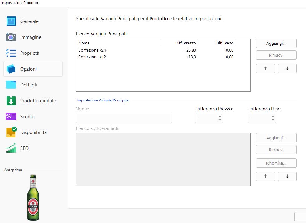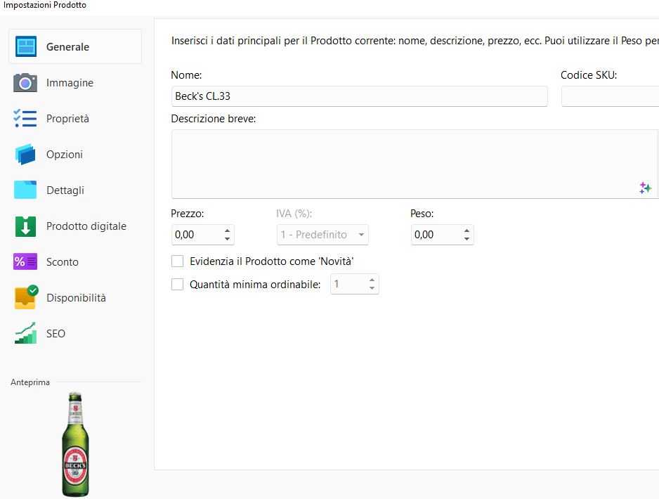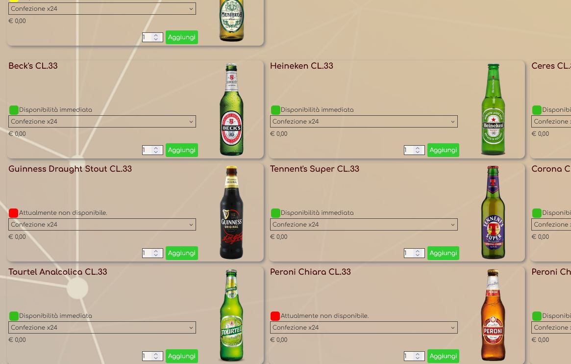 Come noti i prezzi risultano a zero, mentre si dovrebbe visualizzare il prezzo della prima opzione: nel caso del prodotto Beck's si dovrebbe vedere il prezzo della Confezione x24 che è l'opzione visualizzata di default, invece va a prendere il prezzo 0,00 inserito come prezzo principale..