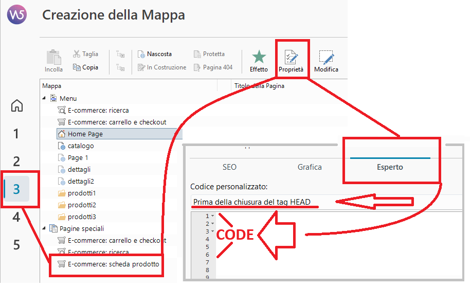 ... incollare il codice al Passo_3 nelle Proprietà della Pagina Speciale "schede prodotto" > Esperto > Prima della chiusura del tag /HEAD...
