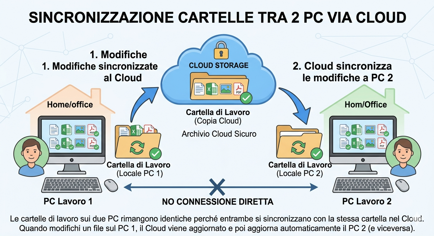 L'immagine mostra chiaramente come i file modificati sul "PC 1" vengano caricati automaticamente sulla "Nuvola" (Cloud) e, da lì, scaricati e aggiornati sul "PC 2". Lo stesso processo avviene in direzione opposta, garantendo che le cartelle su entrambi i dispositivi siano sempre identiche e aggiornate. Le frecce colorate e le icone aiutano a visualizzare il flusso dei dati in modo immediato.