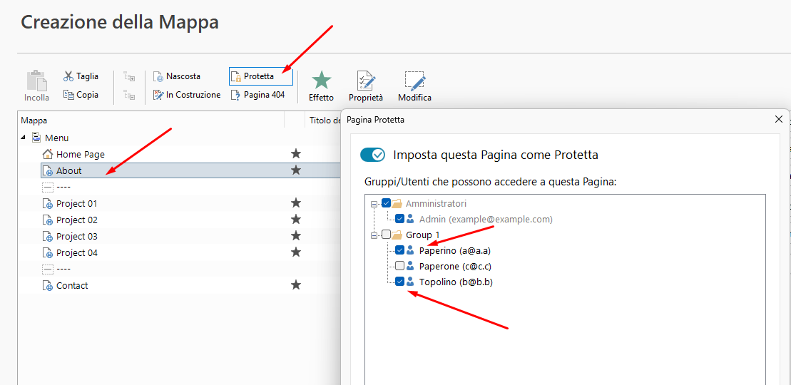 Ad esempio, la pagina dell'esempio sottostante non è accessibile da Paperone anche se fa parte del Gruppo 1 come gli altri, perché sono stati selezionati solo gli altri 2 utenti.