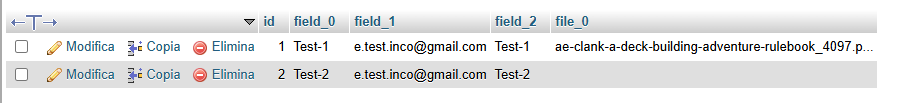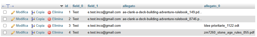 Sia sul DB Viewer che nella tabella verificandola su PHP MyAdmin i record risultano regolarmente registrati e visibili anche se il campo "allegato" creato nel Modulo Contatti originario non viene più popolato, in quanto ora sostituito da allegato_0 dopo la conversione del sito di prova.