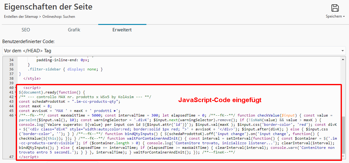 Bei den Spezialseiten unten kann bei Shop-Suche zwar der Javascript-Code hinzugefügt werden, aber er hat keinerlei Wirkung, siehe Screenshot (2) unten