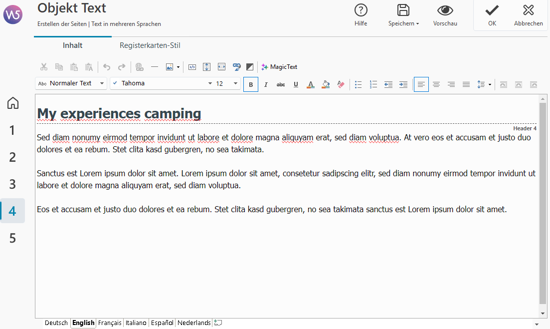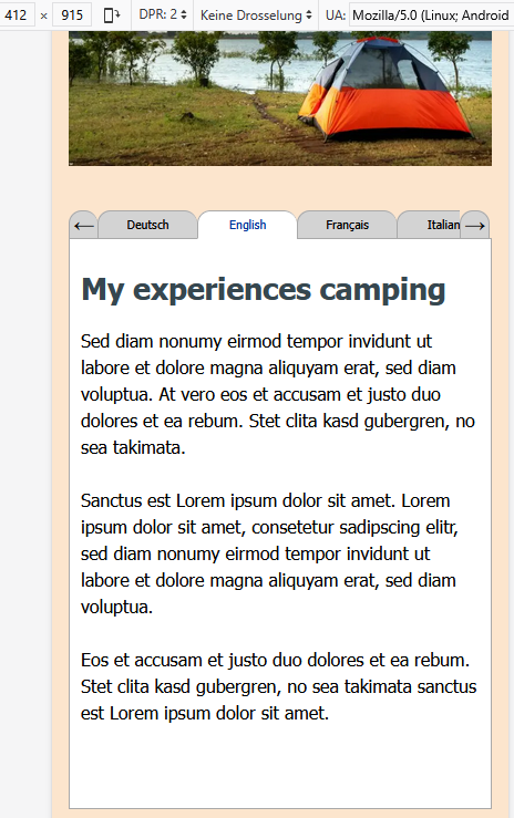 I used a text object on my test page and expanded it to 6 languages ​​in 6 tabs, see
