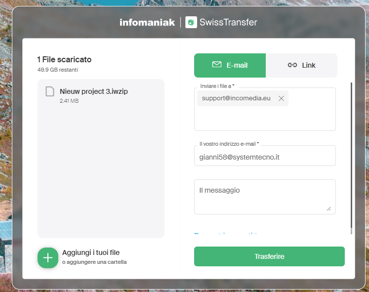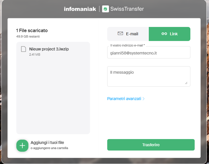 Le impostazioni del trasferimento dovrebbero risultare così scegliendo l'opzione E-mail per l'invio diretto da parte di SwissTransfer