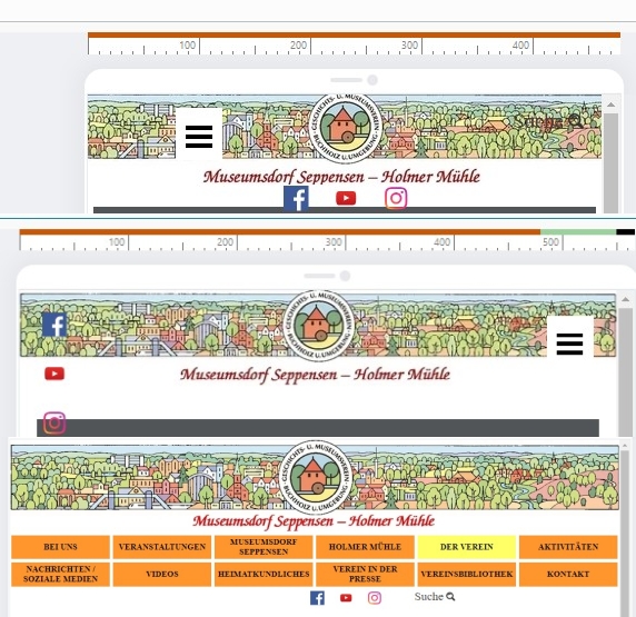 ich will meinen vorhandenen Header erweitern, indem ich dort noch die Buttons zu den sozialen Netzwerken und die Suchfunktion einbringe. Sieht in der Desktopversion (1) relativ gut aus. Bei den kleineren Formaten wird es aber chaotisch. (s.u.)