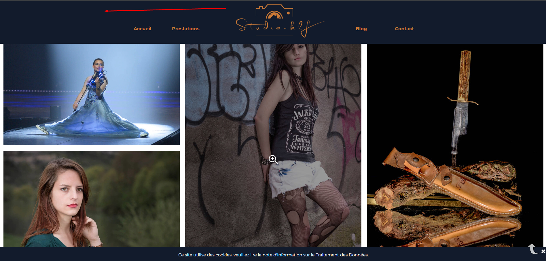 des ancres sont sur : voir la galerie (pointée sur le titre galerie de photographie) et sur chaque vignette de prestation (voir le détail) pour envoyer plus bas.