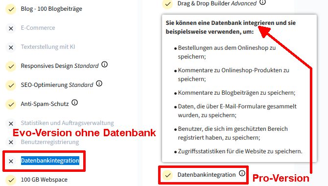 In der Evo-Version gibt es keine Datenbankintegration, siehe Link und Screenshot unten