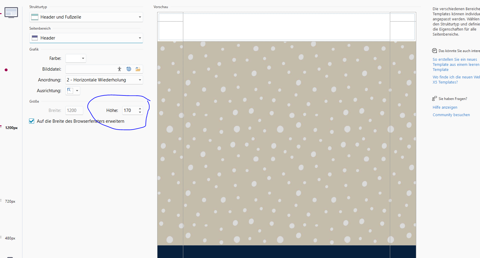 Ich möchte die Höhe meines Headers vergrössern, da ich zusätzlichen Platz für eine Suchleiste benötige. Mein Problem ist folgendes: Sobald ich die Höhe des Headers (z. B. von 150 auf 200) ändere, wird die weisse Hintergrundfarbe nicht für den neu gewonnenen Platz übernommen. Stattdessen wird dort der braun-graue gepunktete Seitenhintergrund angezeigt.