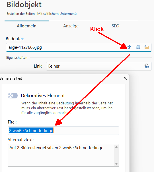 In der aktuellen Version gibt es bei Bild-Objekten das Symbol "Männchen" für Barrierefreiheit, hier können Titel (für Mouse Over Effekt) und Alternativtext (für Sehbehinderte) eingetragen werden.