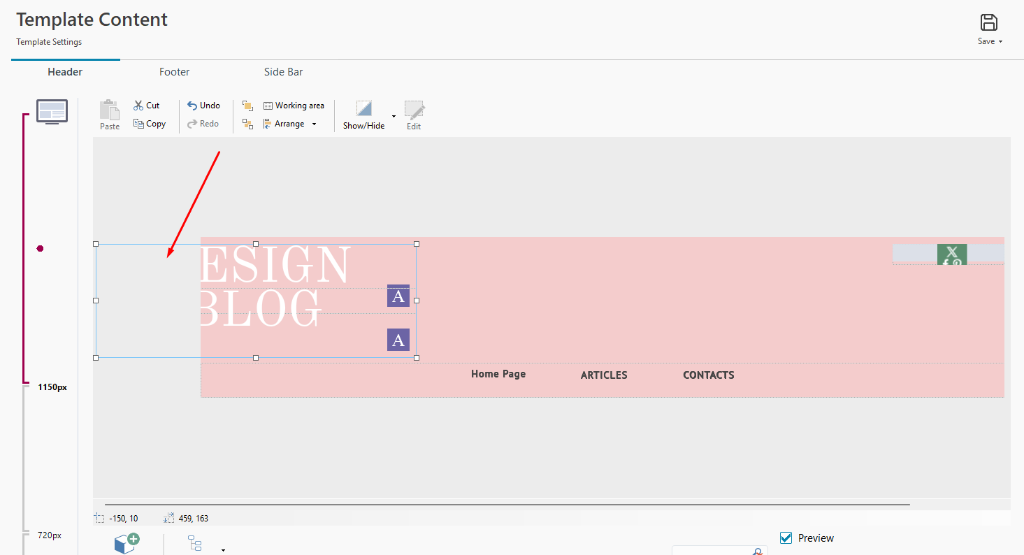 Si un objeto se coloca fuera del área de trabajo disponible en el Contenido de la Plantilla, este se extenderá más allá del ancho habitual.