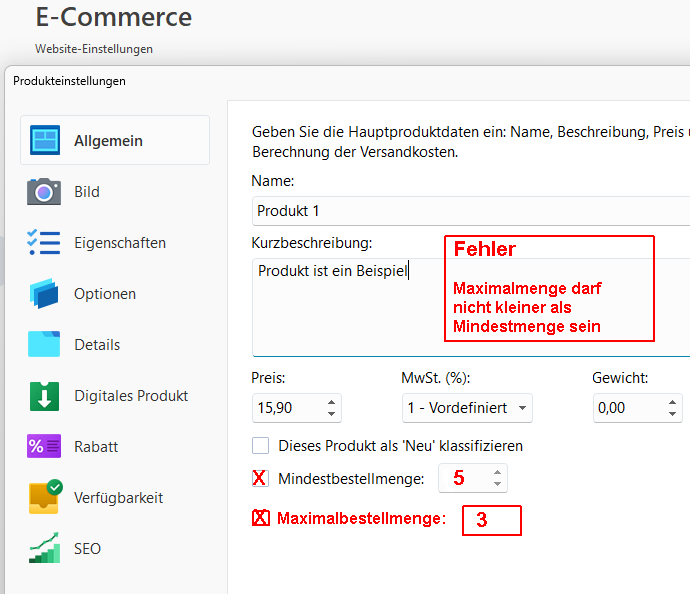 Incomedia sollte dem Shop-Modul die Option "Maximalbestellmenge" hinzufügen und per Code prüfen lassen, dass Minimalbestellmenge und Maximalbestellmenge nicht im Widerspruch stehen.