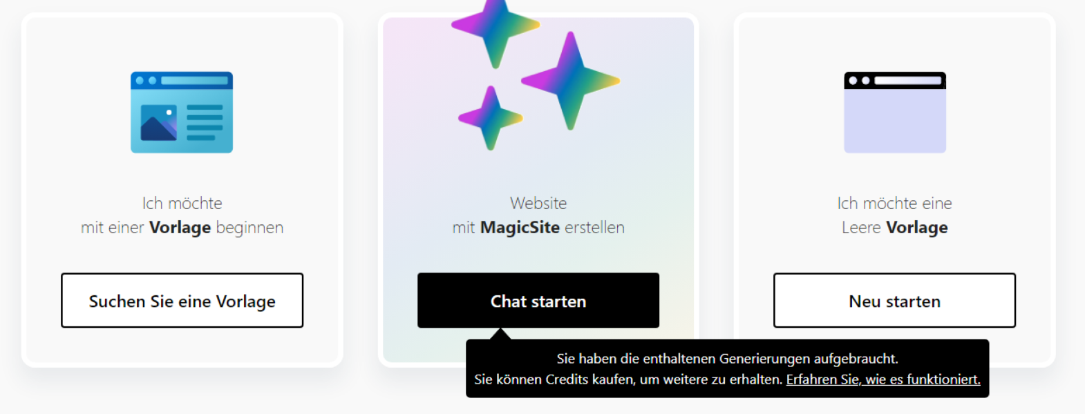 Tja, dann hast du bereits die 10 verfügbaren Website-Generierungen aufgebraucht! Es zeigt ja im Hover an wieviele KI-Generierungen du frei hast. Allerdings weis ich nicht ob die Probegenerierungen in der "Preview" Version auch schon mitzählen, oder man weitere 10 oder 5 KI-Generierungen zur Verfügung hat.