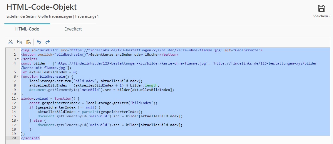 Auch in der jetzigen Form des JavaScripts funktioniert das Anzünden der Kerze. Das Problem ist nur, dass beim erneuten Aufruf der Traueranzeige die Kerze nicht mehr brennt.