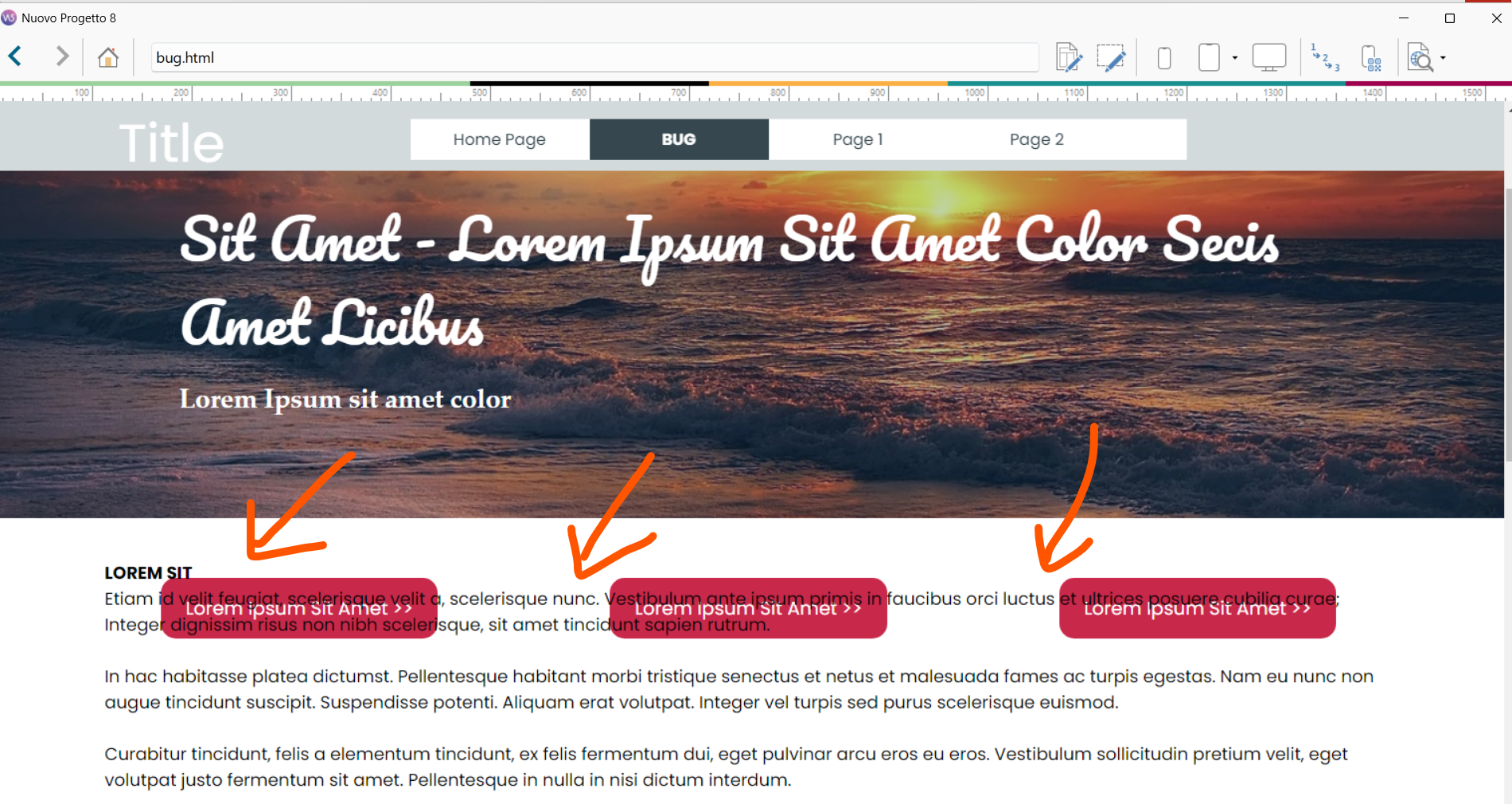 Ciao, nella pagina ho inserito tre oggetti Pulsante in alto e un oggetto Testo sotto di essi...