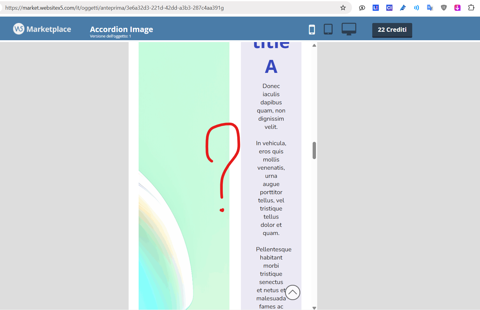 Ciao staff, ho dei crediti in scadenza oggì, con l'acquisto di altri crediti stavo valutando di comprare il nuovo Oggetto "Accordion Image" ma non riesco a capire come si visualizza da smartphone. Con la vostra simulazione, cliccando sull'icona dello smartphone, vedo tutti i contenuti dei testi dell'accordion allungati a dismisura e idem per le immagini. Ma è quella sotto la visualizzazione finale da smartphone?