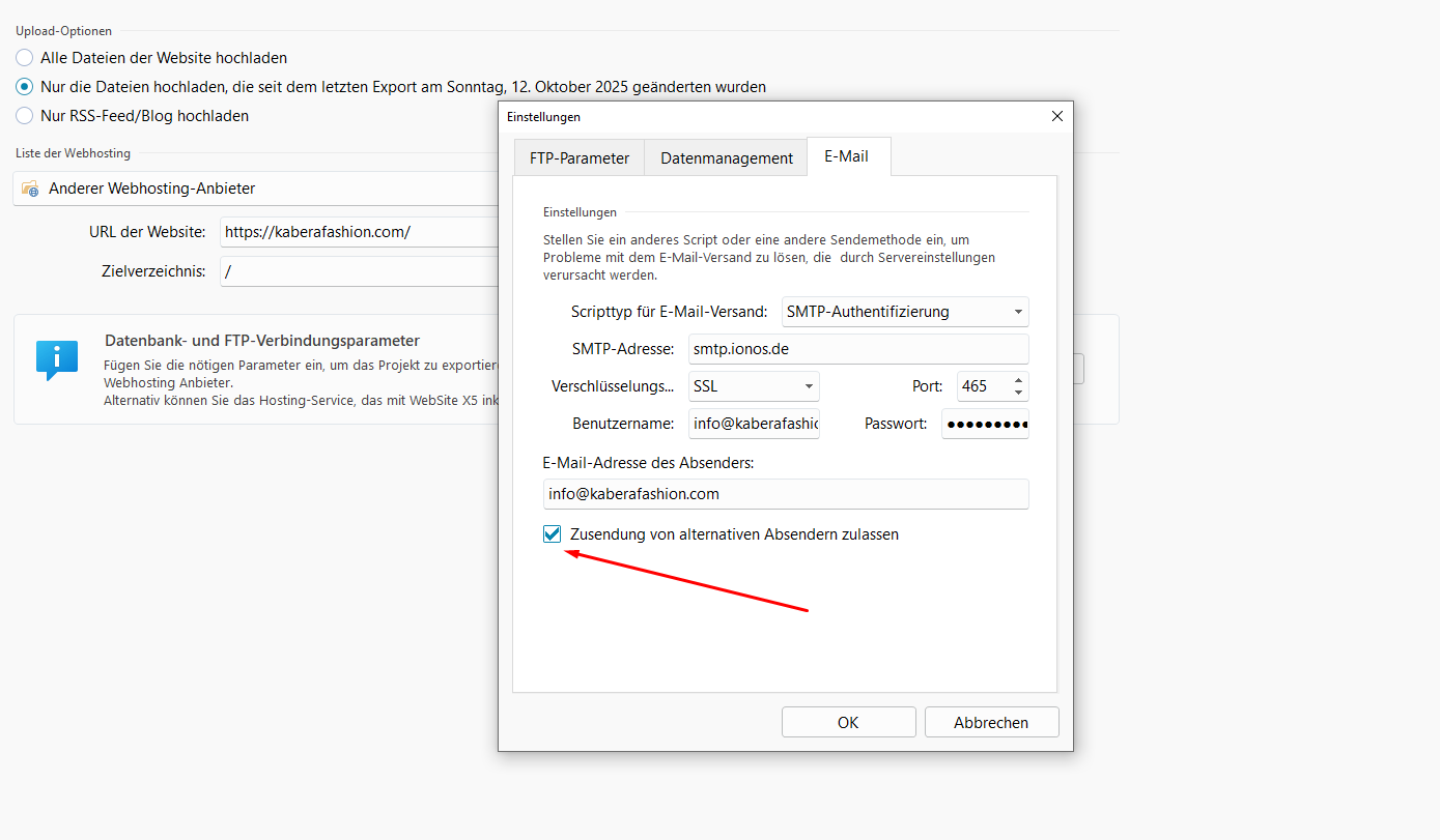 ergänzend zu dem, was Andreas und Daniel erwähnt haben, könnten Sie bitte einen Screenshot Ihrer E-Mail-Einstellungen in Schritt 5 – Exportieren → Ins Internet hochladen → Parameter bereitstellen?