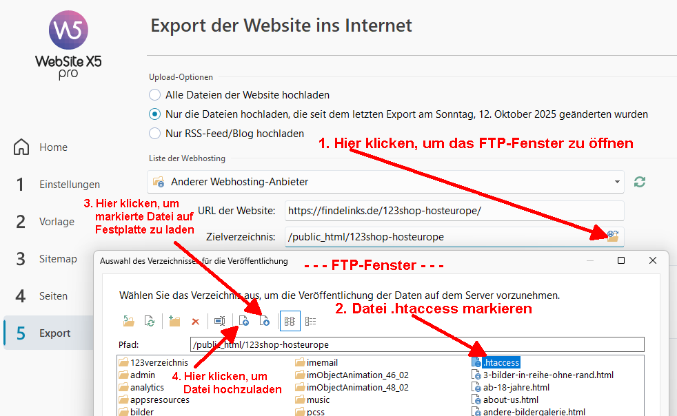 Herunter- und Hochladen der Datei .htaccess mit Hilfe von WebSite X5, siehe Screenshot unten