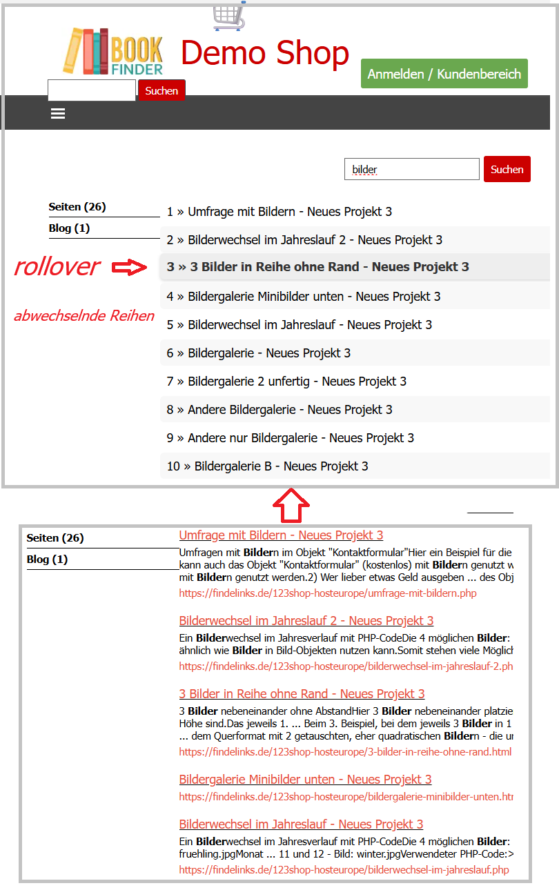 Ergebnis wäre eine Linkliste mit Menü-Namen der Seiten, die das gesuchte Suchwort enthalten.