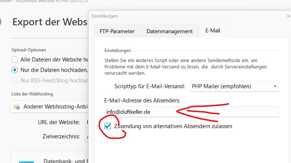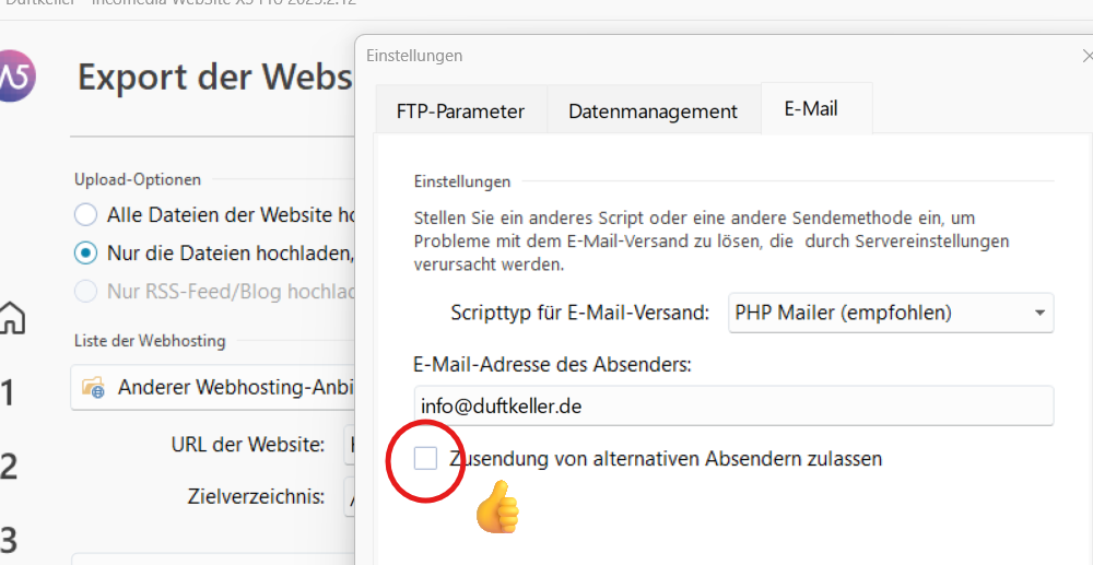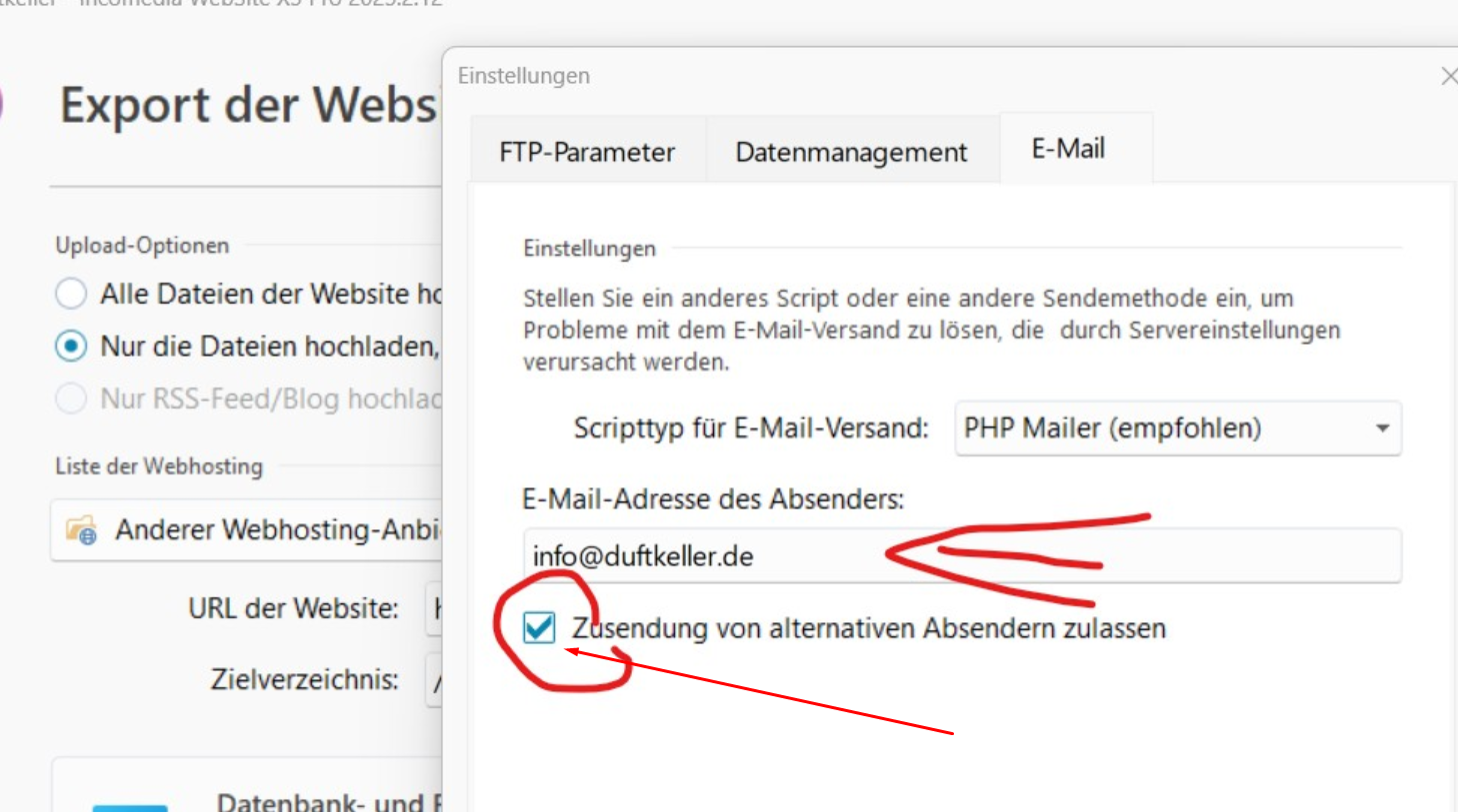 Natürlich muss dann bei "5 Export" auch die "URL der Webseite" so eingetragen werden.