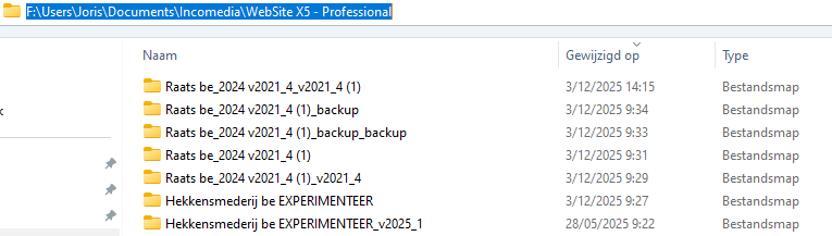 I copied some of the latest .iwprj2 to the "F:\Users\Joris\Documents\Incomedia\WebSite X5 - Pro" folder, and changed the preferences in 2025.2.12 to this folder. The projects still wheren't visible.